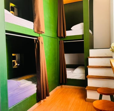 Modern mixed dormitory with 5 capsule beds that ensure comfort, privacy, and practicality. It features air conditioning, individual curtains, a fan, power outlets/USB ports, personal lighting at each bed, and a locker.